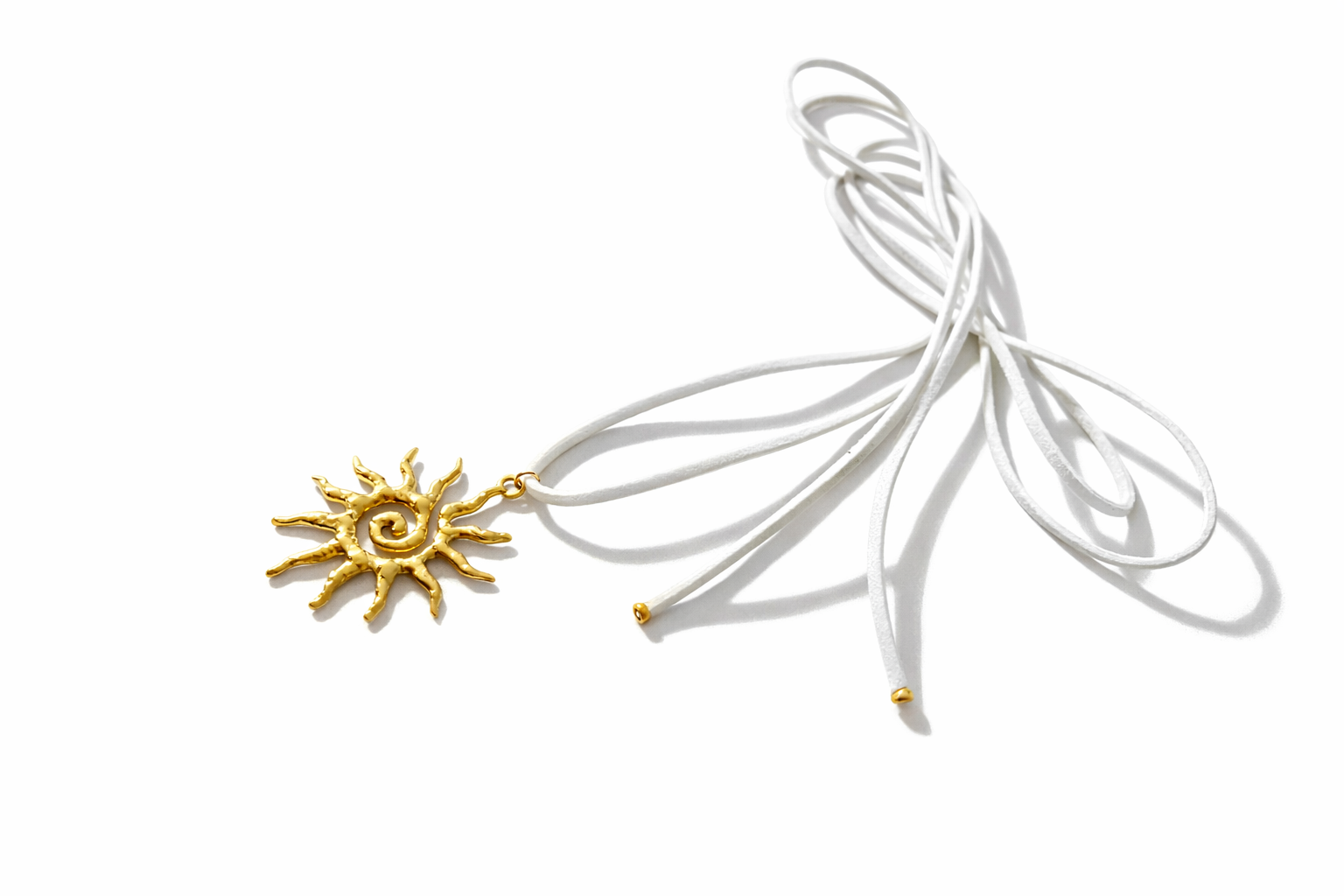 Tilføj et unikt og tidløst udtryk til din stil med denne smukke guld halskæde med solvedhæng. Det detaljerede vedhæng symboliserer energi, styrke og balance, mens den bløde læder-/ruskindssnor giver et naturligt og moderne look. Halskæden er let at kombinere med både hverdagstøj og mere elegante outfits.