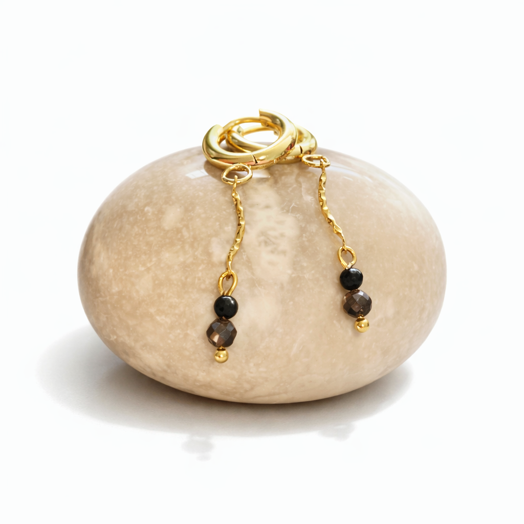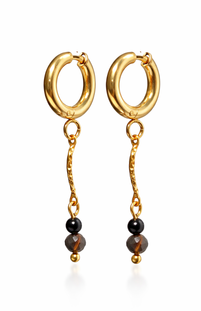 Det let bølgede mellemled giver øreringene et levende og organisk udtryk, mens den mørkebrune halvædelsten fanger lyset på en diskret og elegant måde. Resultatet er et par øreringe, der føles både moderne, eksklusive og lidt mystiske.
