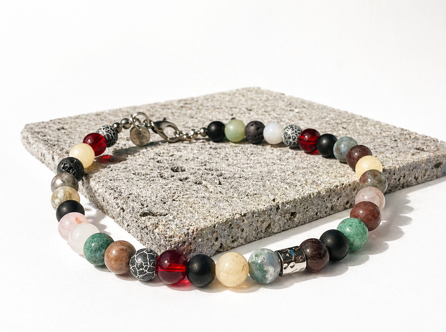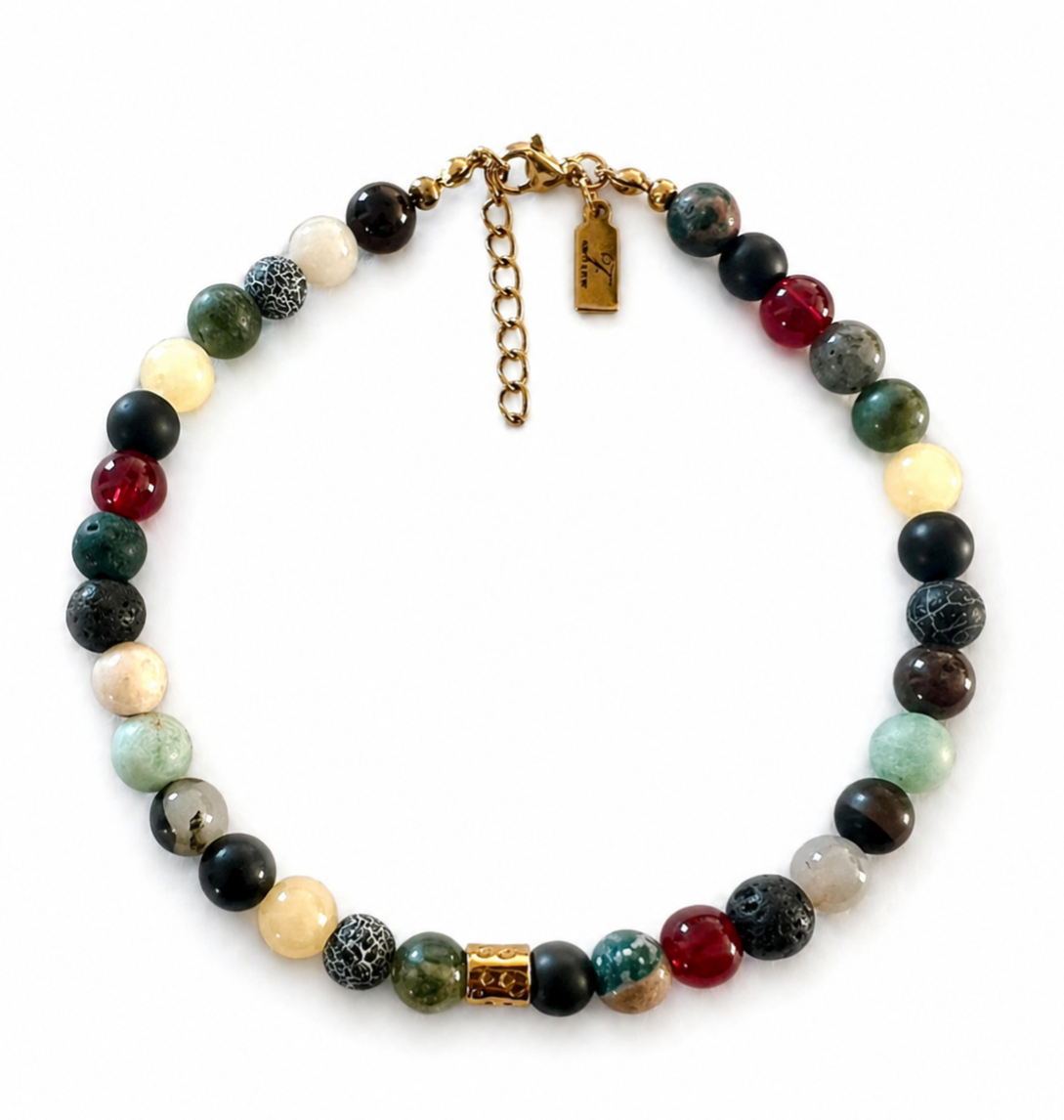 Unikt armbånd med knald på farver men alligevel et naturligt look, sammensat af smukke halvædelsten i 6 mm.