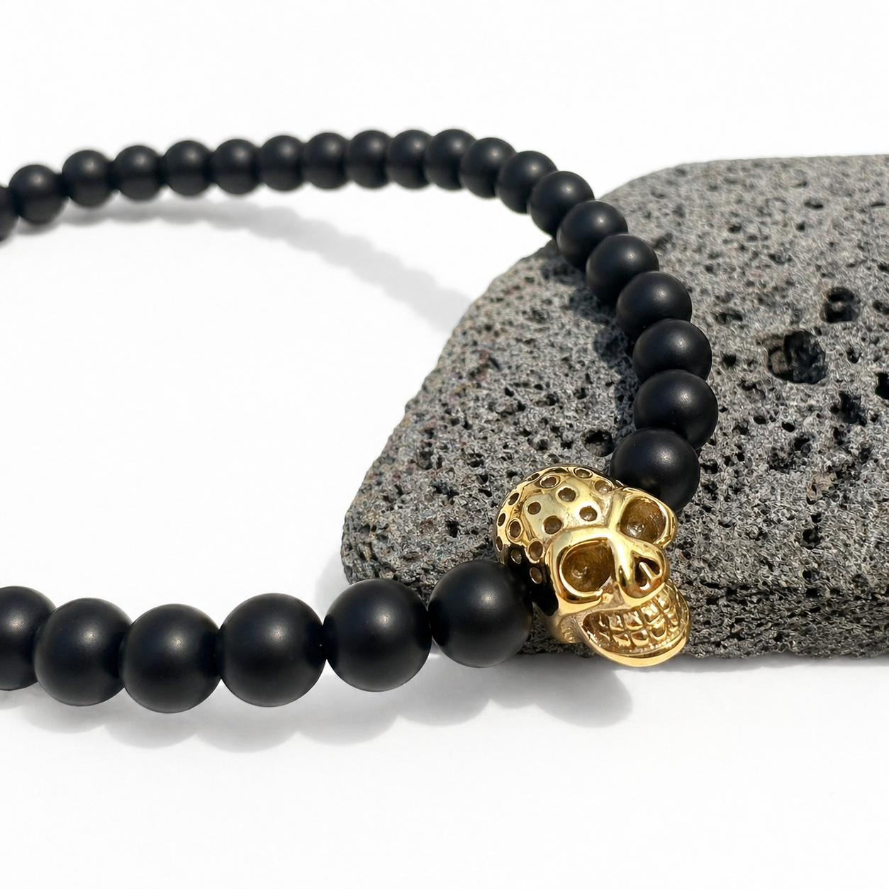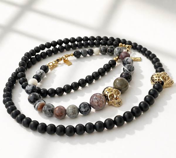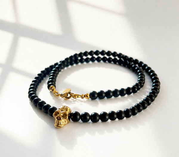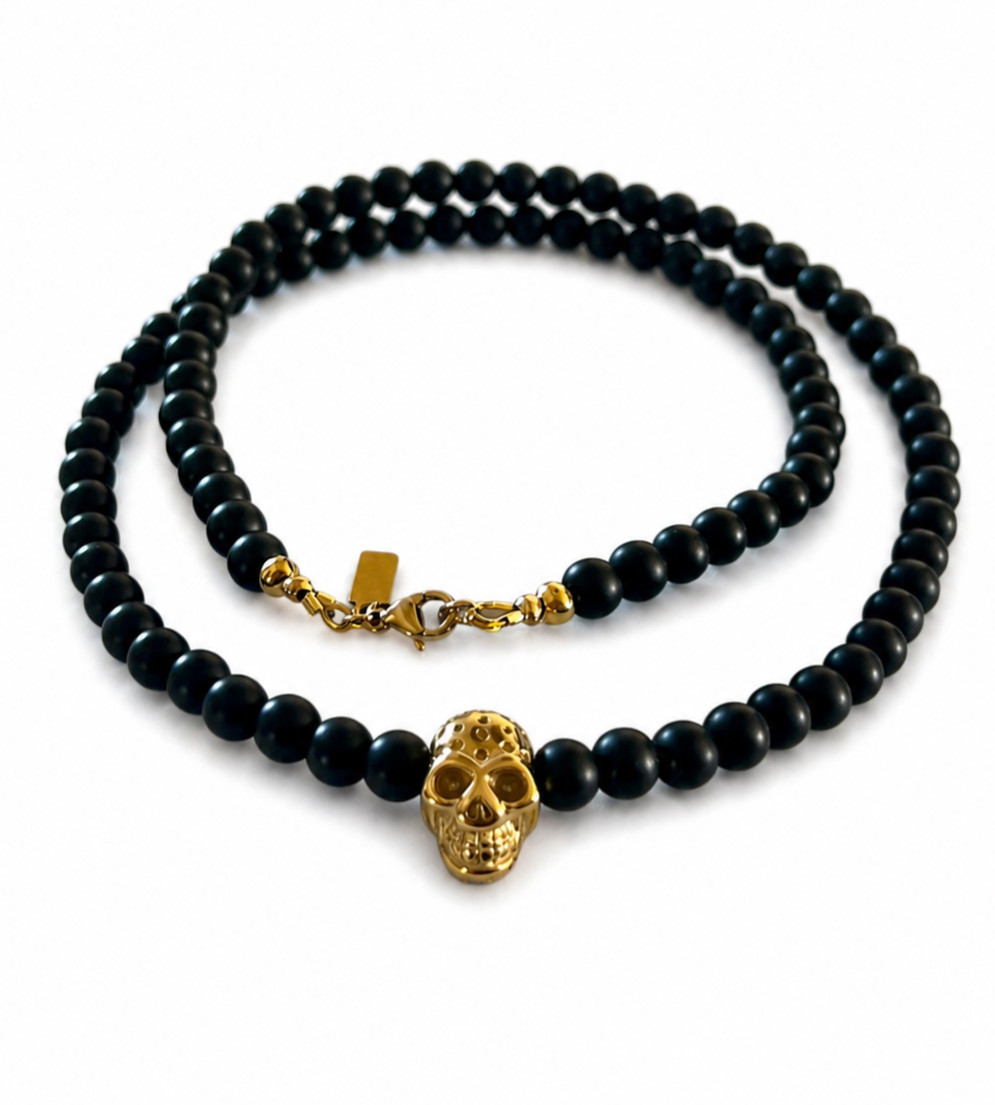 Halskæde Kombinationen af de matte sorte sten og detaljer i guld hoved skaber et råt, men elegant look, der kan bruges både til hverdag og særlige anledninger.